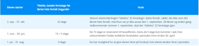 – Optjent ferie i første ansættelsesår: Hvis eleven starter efter 1. september, optjener de ferie i forhold til ansættelsesperioden. Det betyder, at de måske har færre feriedage i deres første ferieår. Eksempelvis vil en ansættelse i februar resultere i ca. 12 optjente feriedage ved ferieårets afslutning.